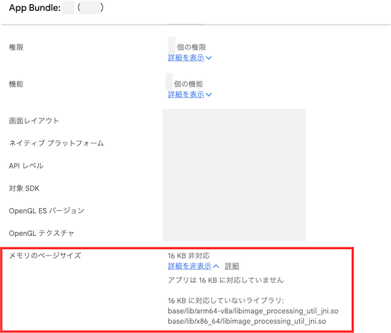 一方、「16KBに対応していないライブラリ」の欄があり、「〜.so」(ネイティブ共有ライブラリ)の表記があると、パッケージ更新が必要になると思われます。