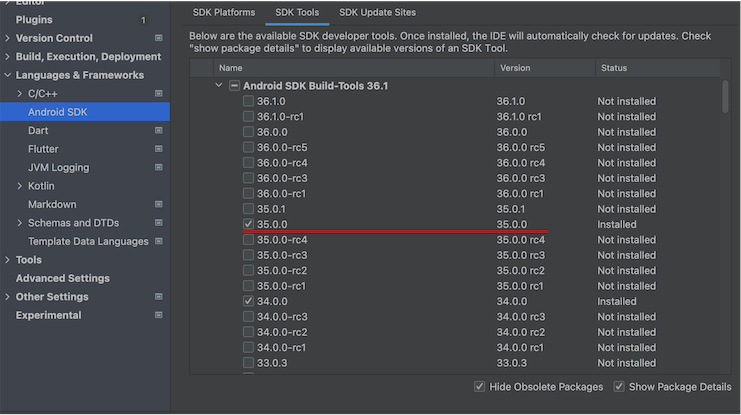 ①Android SDK Build-Tools 35.0.0をインストール(入っていない場合)