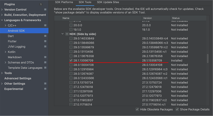 自分の場合は、「26.1.10909125」を使っていたので、下図のとおり、Android Studioにて、NDKの「28.1.13356709」をインストールした上で、