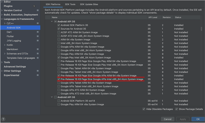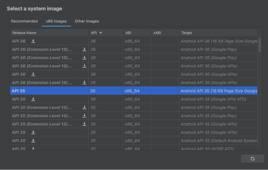 以下は、あくまで自分の環境の例ですが、Android Studioで、下記の通り「16KB Page Size」のシステムイメージをインストールし(下図はAPI 35のエミュレーターを作成する場合の例)、