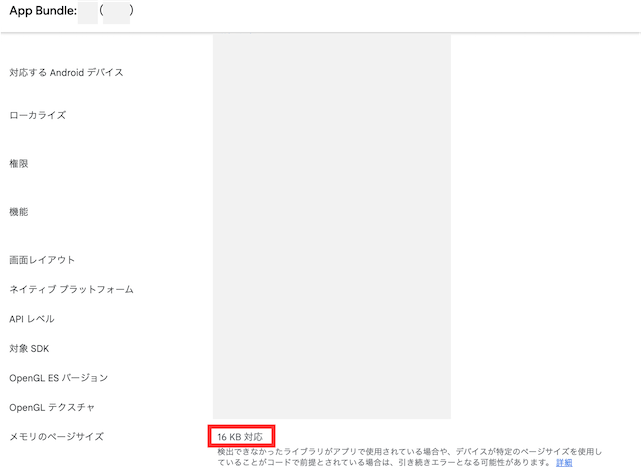 ここで「16 KB 非対応」となっていれば、要対応を意味します。
