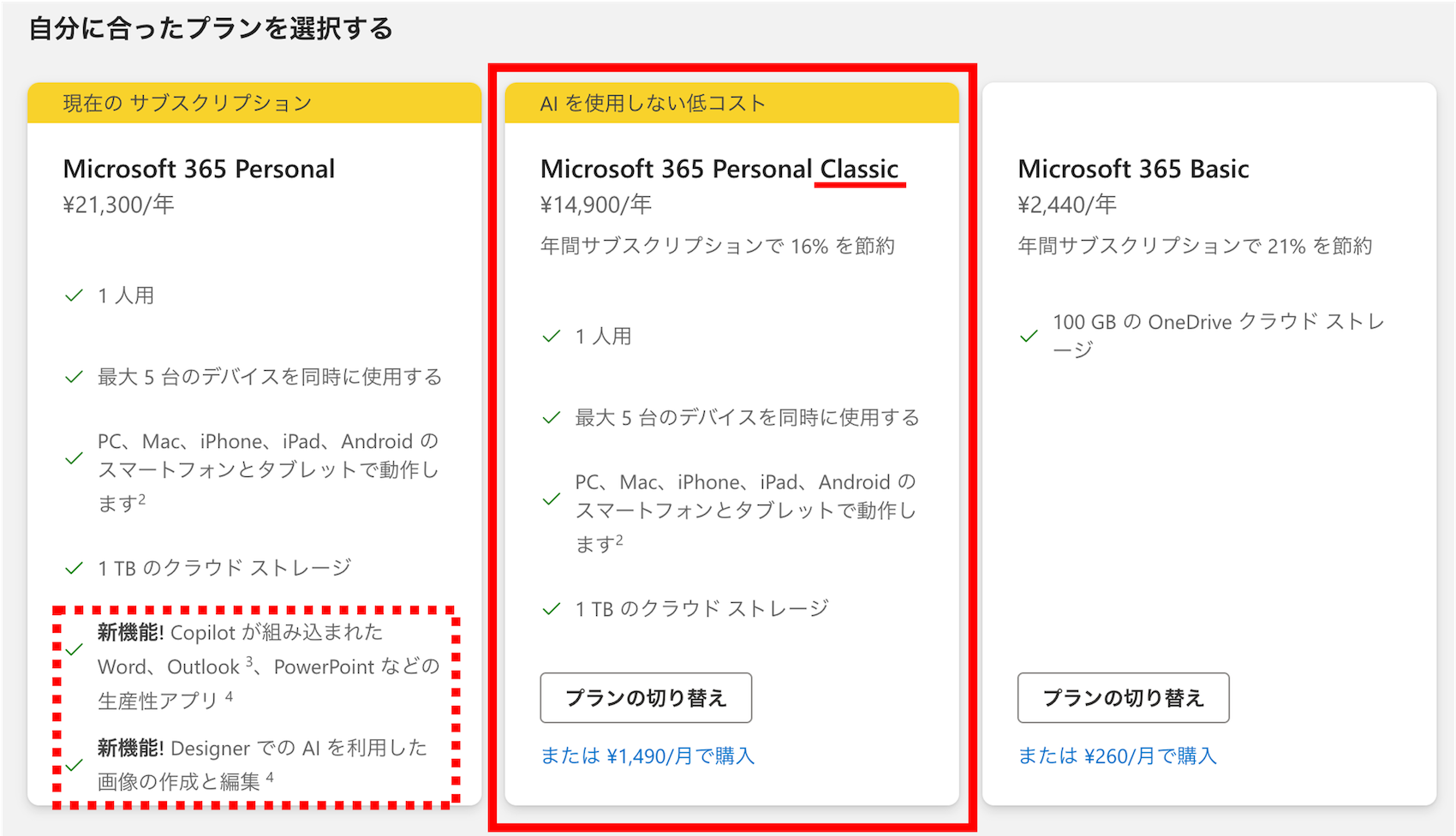 実は、AIの「Copilot」を搭載したことによる値上げであり、AI(Copilot)が不要なら、値段据え置きの「Classic版」に切替可能という事です。