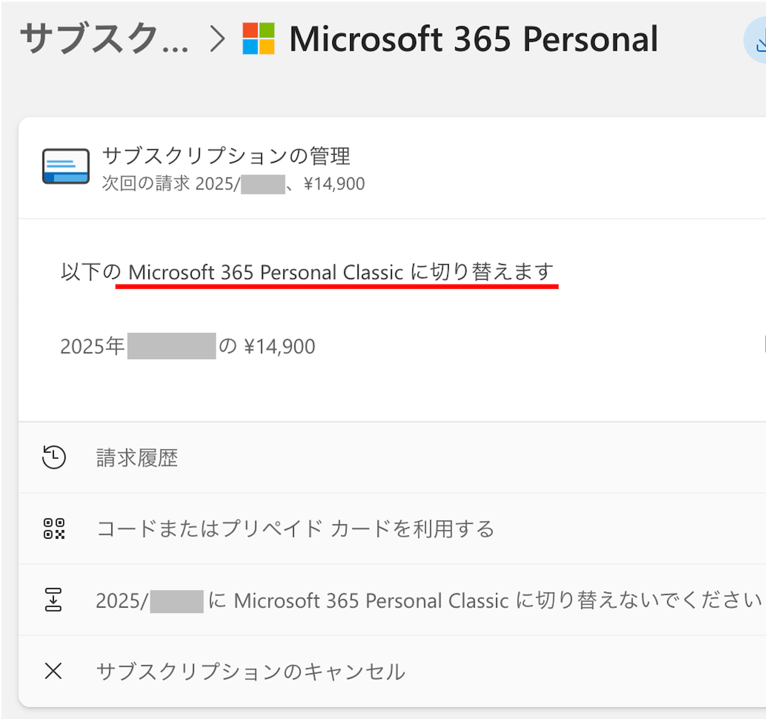 「Microsoft 365」の値上げに伴い、「Microsoft 365 Personal」を「Microsoft 365 Personal Classic」に切り替えようとしたのですが、自分の管理画面の挙動が、ネット上の情報とは異なっており、やや苦労しました。。